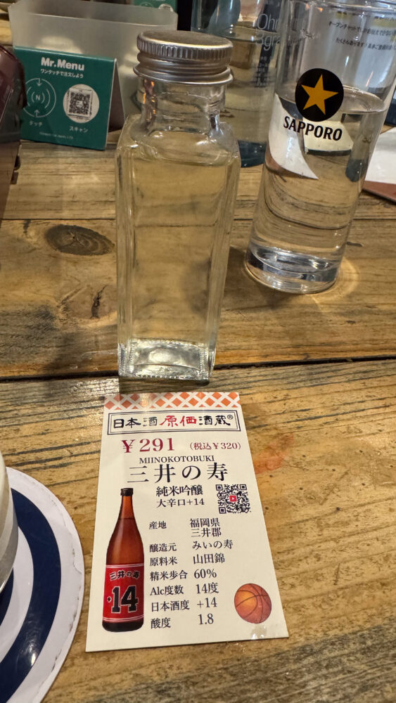 ▲日本酒のおかわりは三井の寿。スラムダンクの三井寿の名前の由来になり、逆輸入的に日本酒のラベルもスラムダンクのユニーフォームになったみたいです。辛口で美味しい。