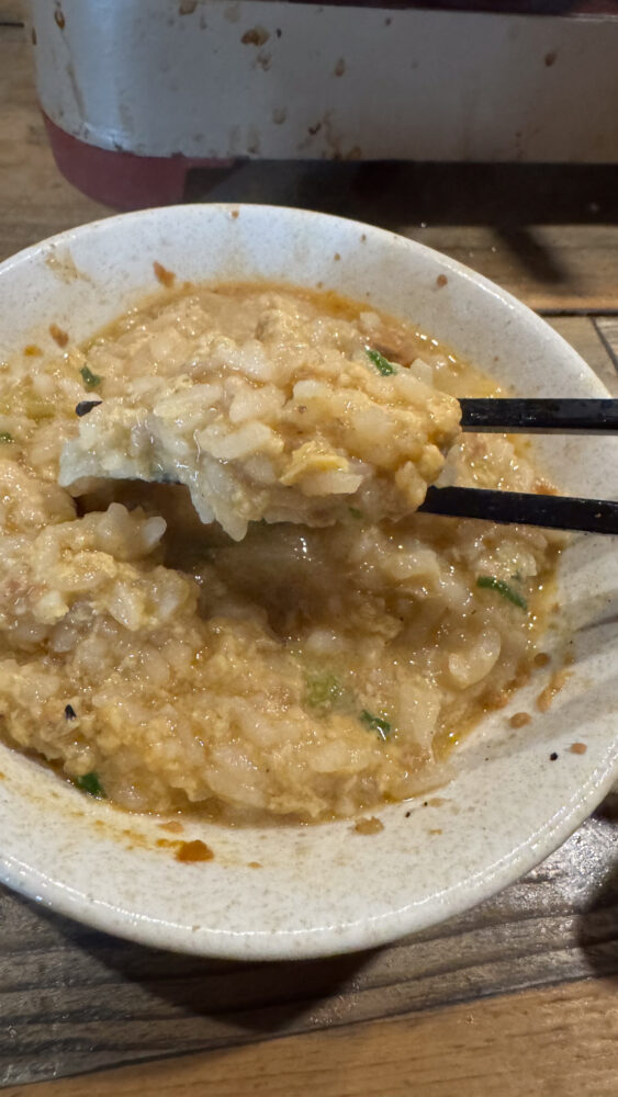 ▲具材やダシの旨味を吸った雑炊が最高に旨い。アツアツなのでハフハフと楽しみます。