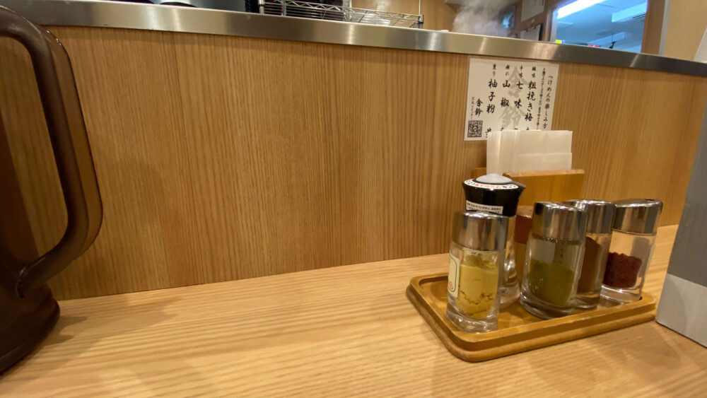 ▲卓上には粗挽き梅・七味・山椒・柚子粉と豊富な味変アイテムが多数。