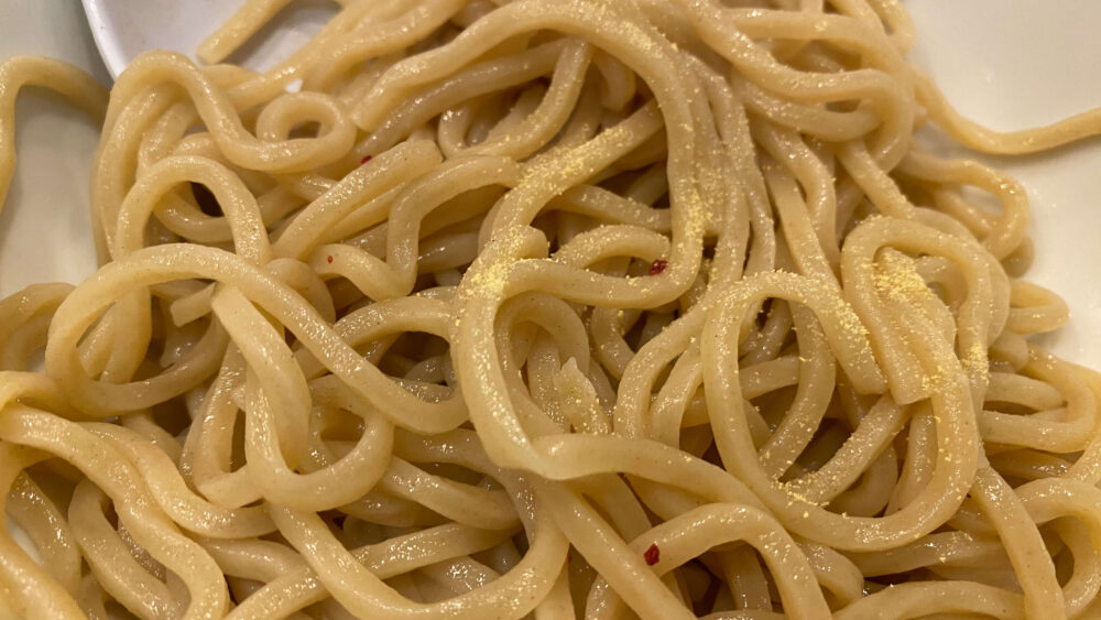 ▲麺。モチっとしていて小麦の風味が良き。特盛は茹で前500gあってなかなかのボリューム。