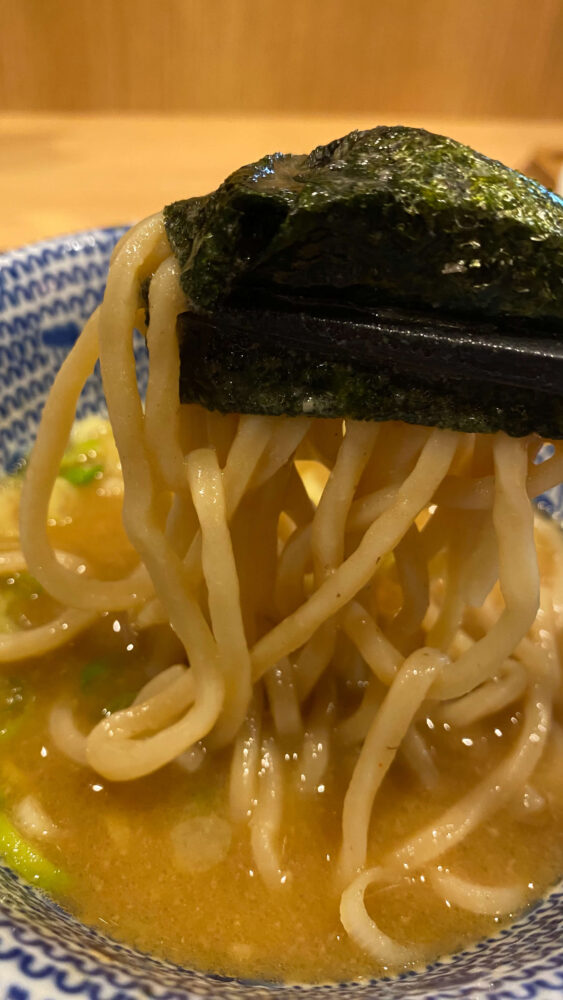 ▲海苔で麺を食べるのも最高。磯感で旨味アップ。