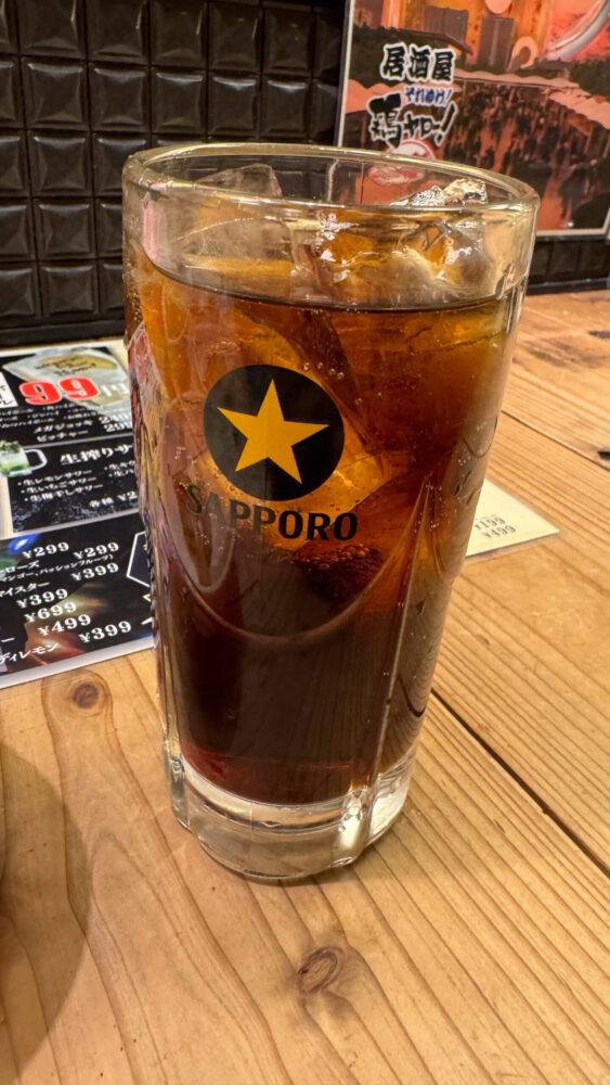 ▲またもやお替り。今度は甘めにコークハイ(税抜99円)。