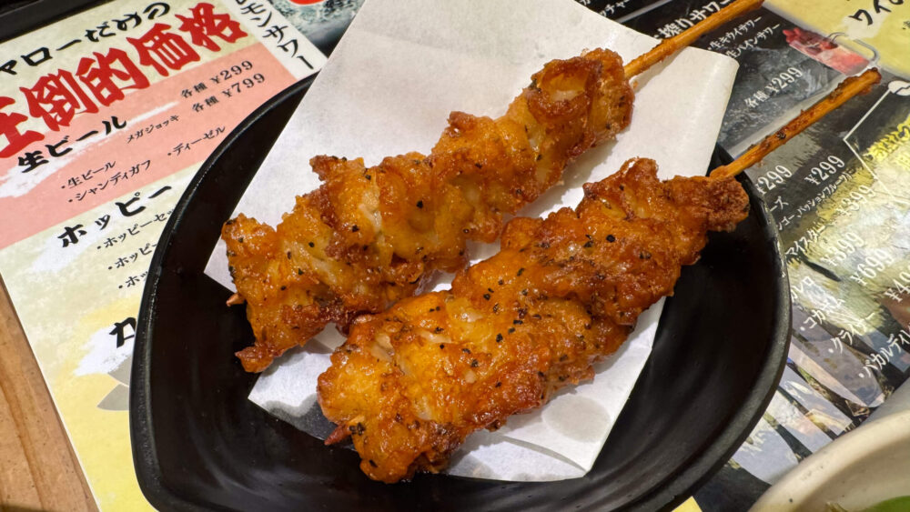 ▲無限に食べられる鶏皮串(税抜99円)。こちらも2本頼みました。