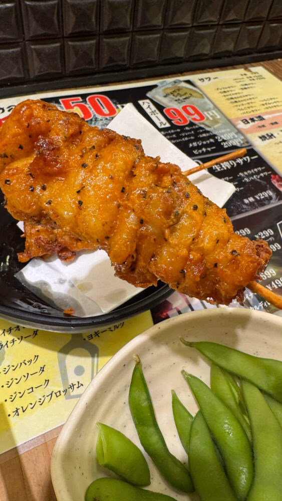 ▲スパイシー皮串(税抜99円)。2本頼みました。