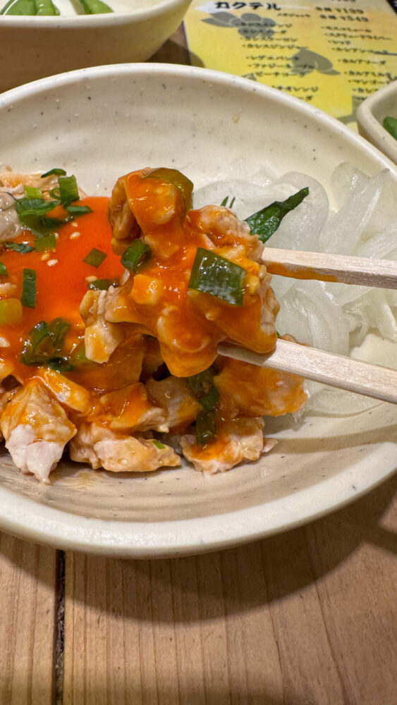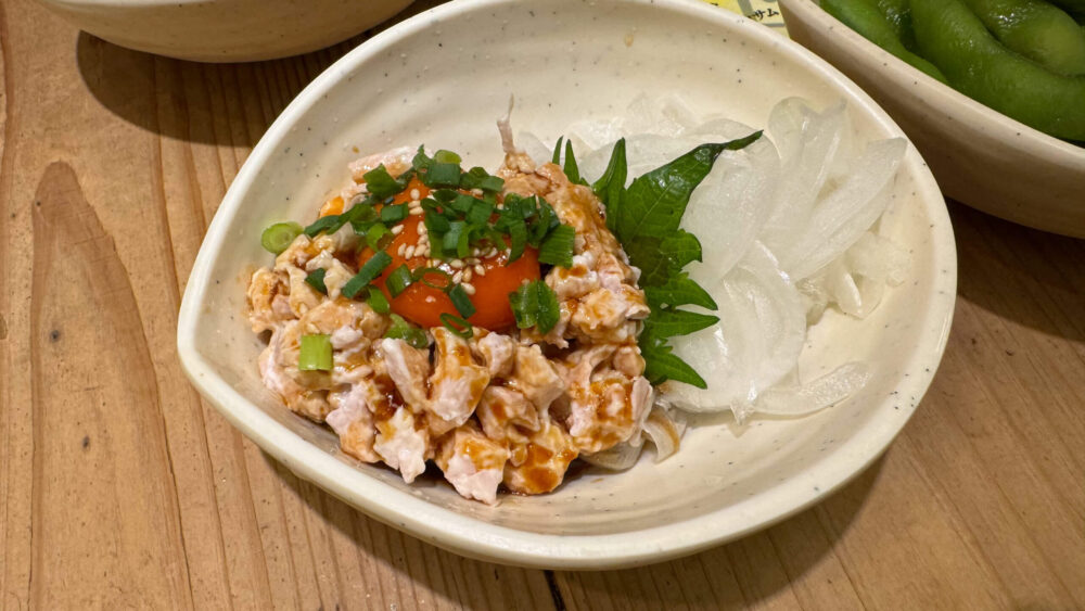 ▲低温調理鶏マヨユッケ(税抜399円)。マヨで和えられた鶏肉と卵黄が美味しそうなビジュアル。