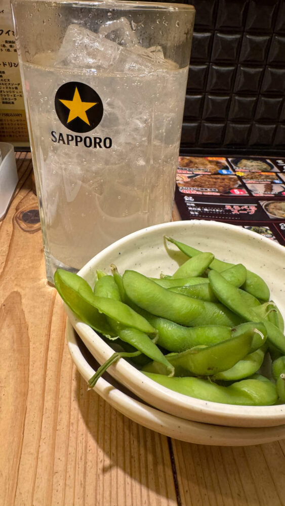 ▲レモンサワーメガジョッキ(税抜149円)とお通しの枝豆(税抜399円)。レモンサワーが疲れた体に染み渡ります。