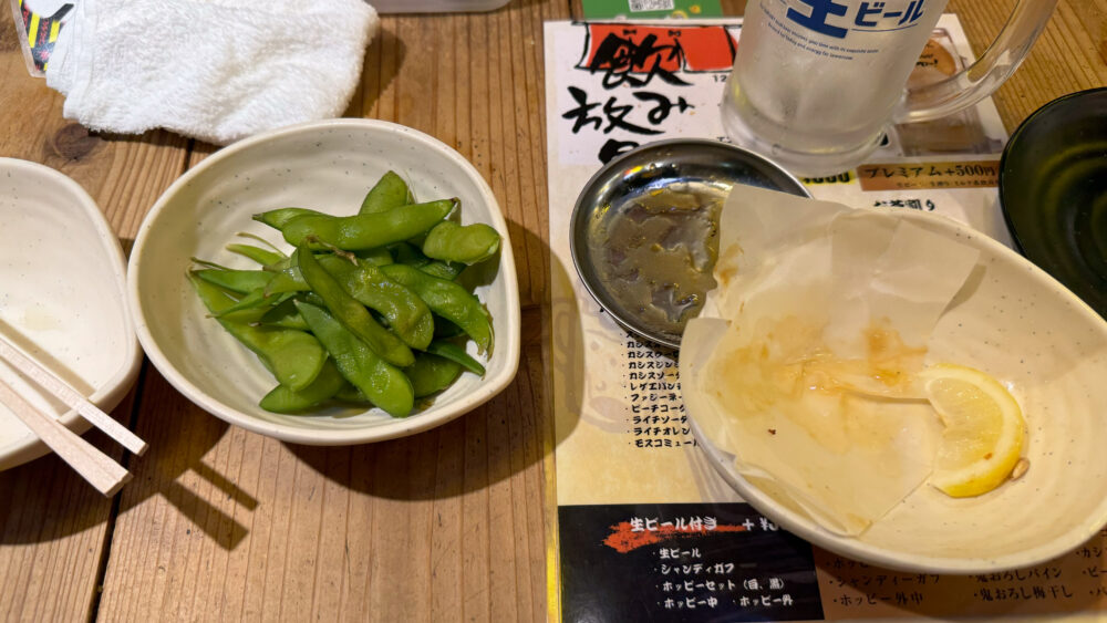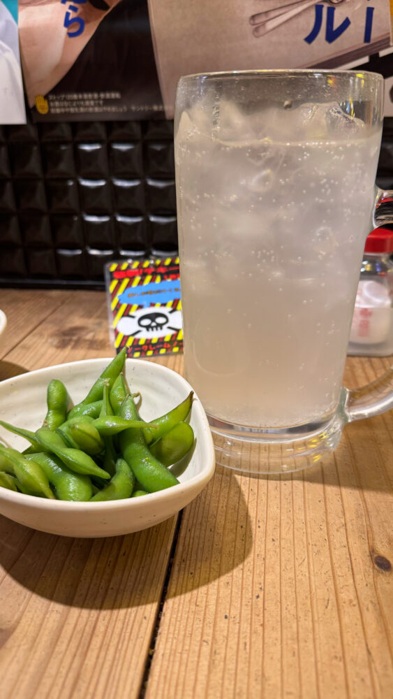 ▲最初にメガジョッキレモンサワーが到着。疲れた身体にレモンの酸味が染み渡ります。お通しは枝豆。