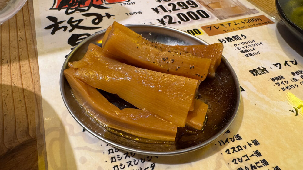 ▲メンマは柔らかい食感で味もしっかりめ。黒胡椒のピリ辛さもあるので、良いお酒のアテ。