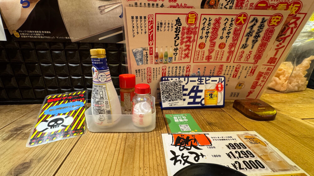▲席のQRコードからスマホで注文。卓上調味料は醤油・七味唐辛子・塩。