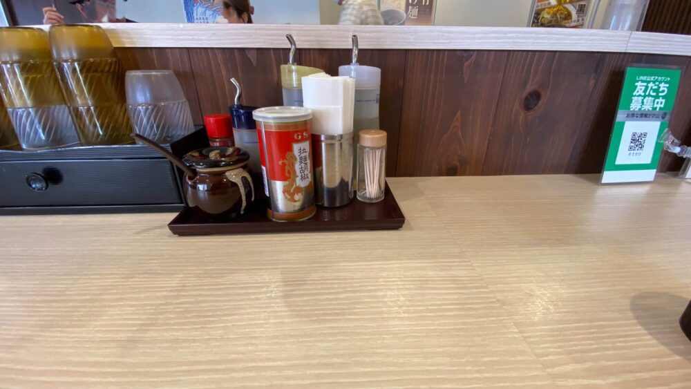 ▲卓上調味料は拉麺胡椒や醤油、ラー油、お酢、七味唐辛子など豊富。