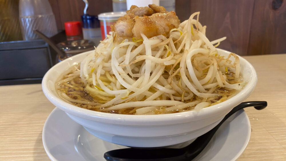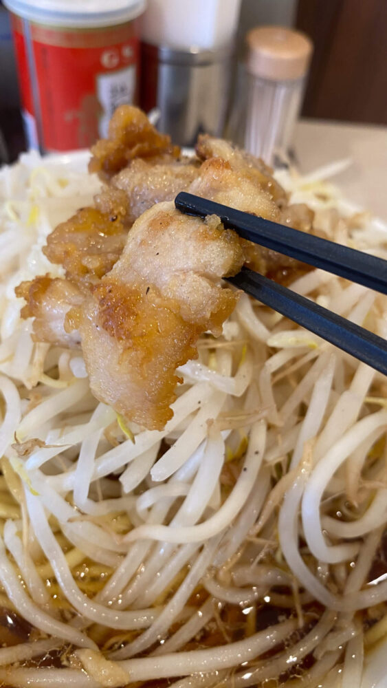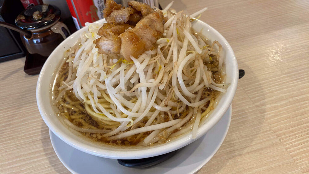 もやしタワーの上に鎮座する豚肉の揚げ物が印象的な二郎インスパイアな一杯!