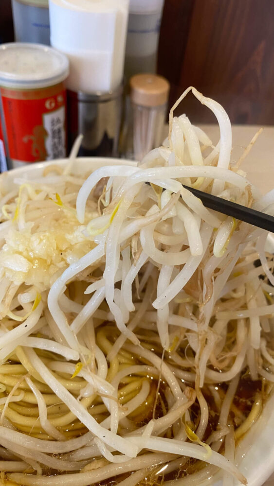 ▲野菜はもやしオンリー。茹で加減はシャキ寄りです。スープで追いかけると最高。