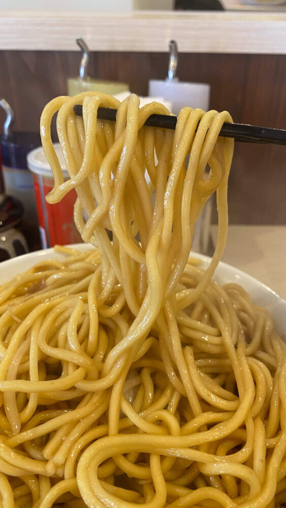 ▲麺は二郎系の中では細め。加水率高めですが、アブラをまとってなめらかなすすり心地。