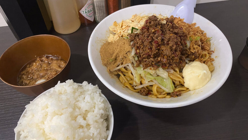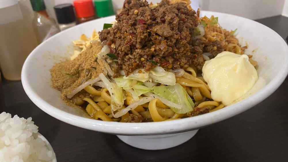具材はひき肉やフライドオニオン、ガーリックチップ、魚粉、マヨネーズ、もやし、キャベツなど盛りだくさん!