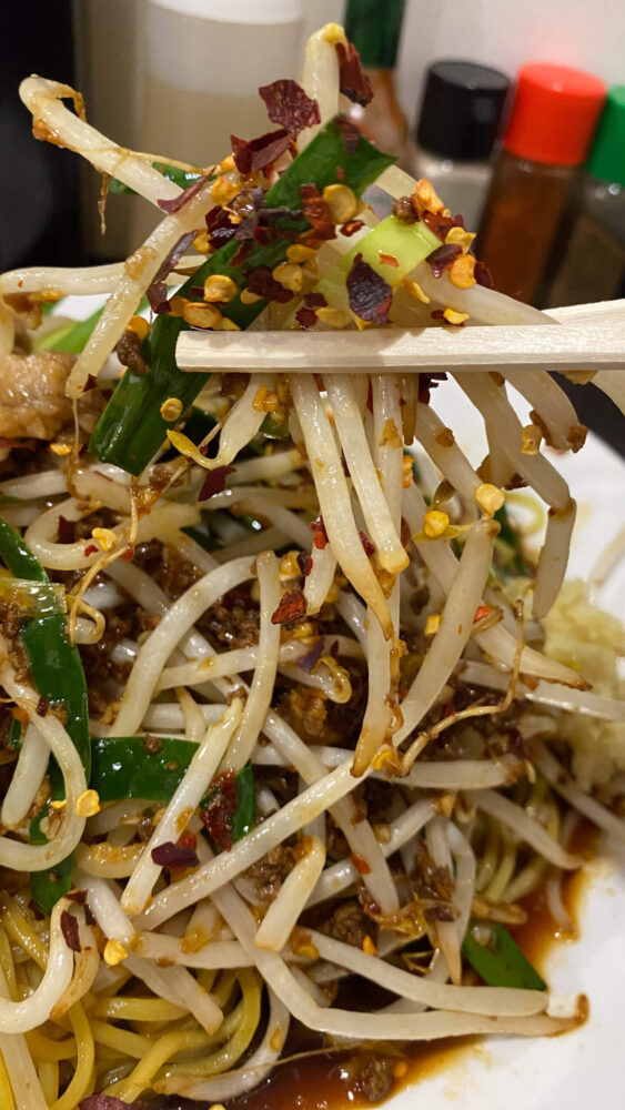 ▲横から見ると、麺の上にはもやし・ニラ・ミンチがこんもり乗っています。ニンニクチップやフレーク状の唐辛子、背脂もあって最高。