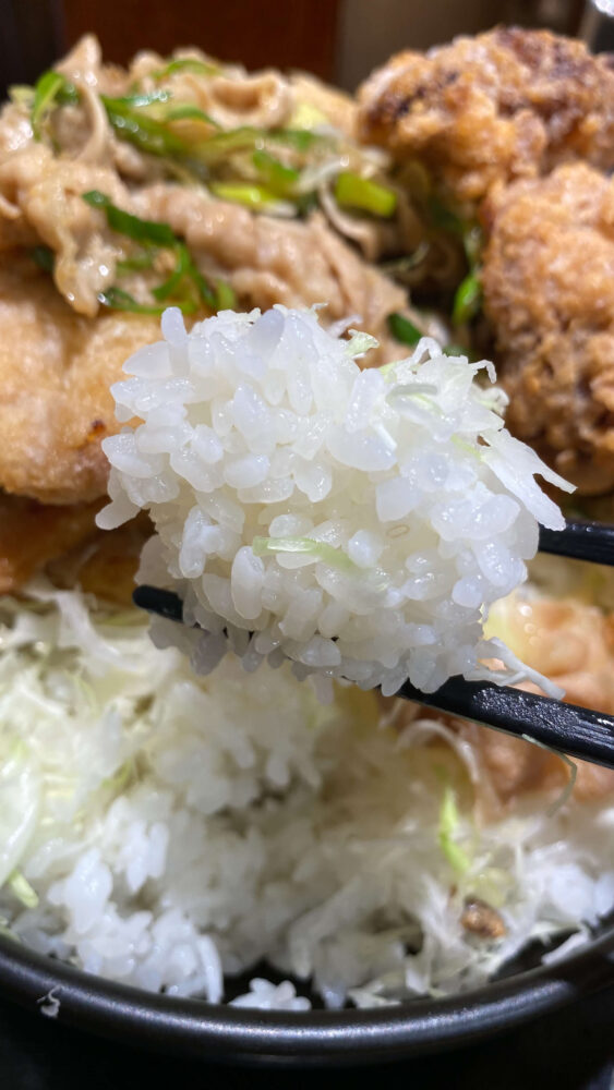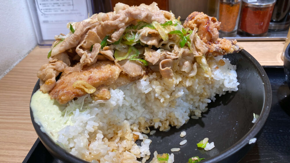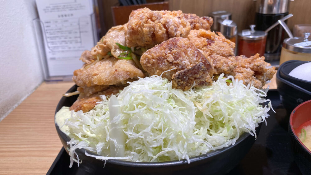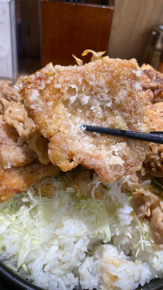 ▲横から見ると、すた丼の豚肉で元からかなりの高さなのに加え、唐揚げで標高がさらに上がっています。