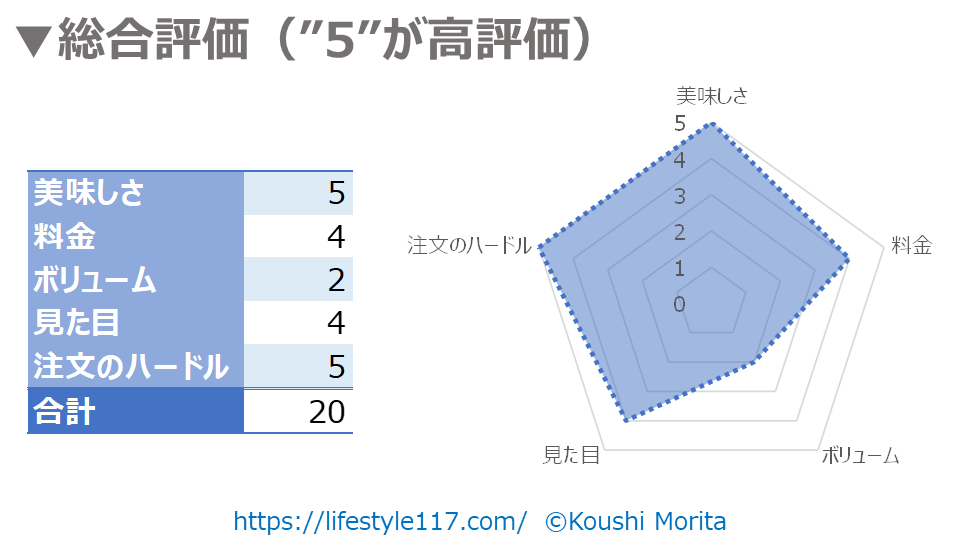 今回は総重量が約800gなので、「ボリューム」が”2”と低めになっていますが、逆に言えばデカ盛りビギナーにはうってつけなボリューム感だと思います。