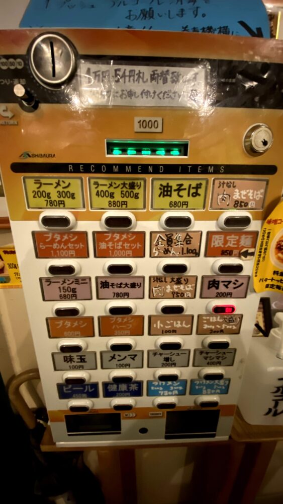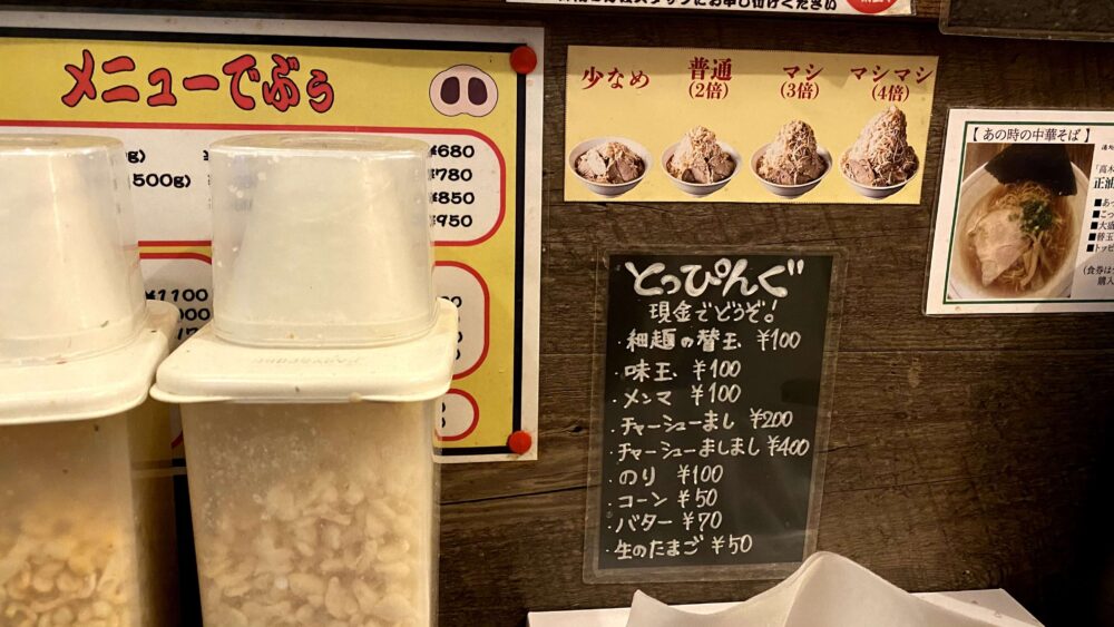 なお、食券機にない有料トッピングもあるので、希望の場合は店員さんへ現金を渡し、希望メニューを伝えましょう。