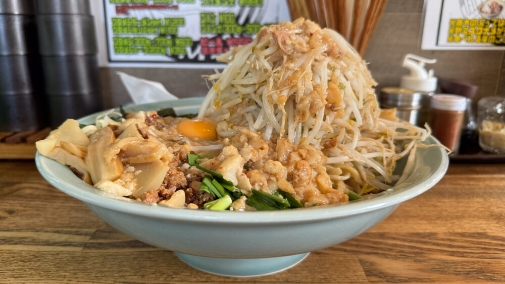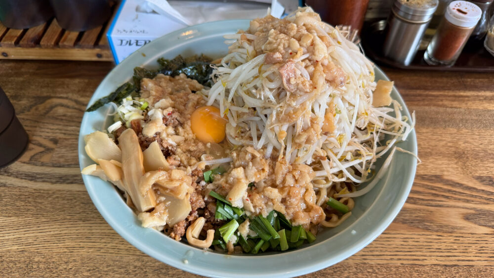 汁ナシ肉ソバ大が着丼!どんぶりの右半分は野菜タワー、左半分は台湾まぜそば的な具材で美味しそう!