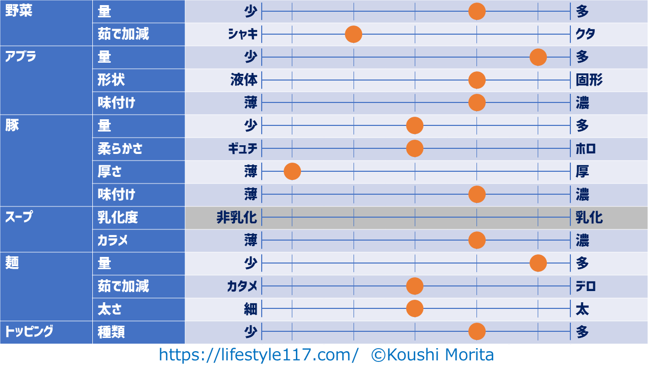 汁なしのため、スープの乳化度はグレーアウトしています。