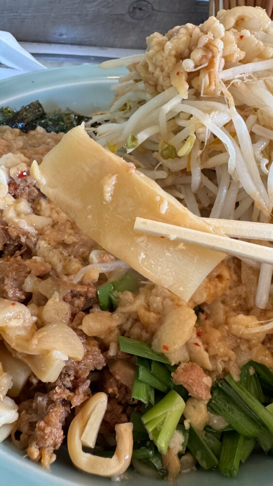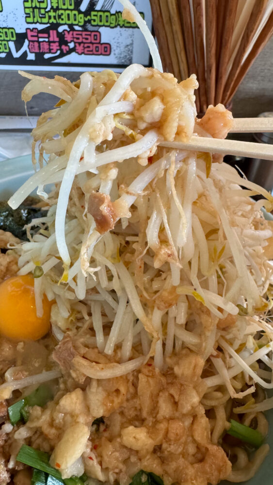 ▲濃いめのタレやほぐし豚、卵黄なんかが混ざった麺がめちゃ旨。ニラや刻み海苔、魚粉なんかの食感や旨みも良いアクセントに。