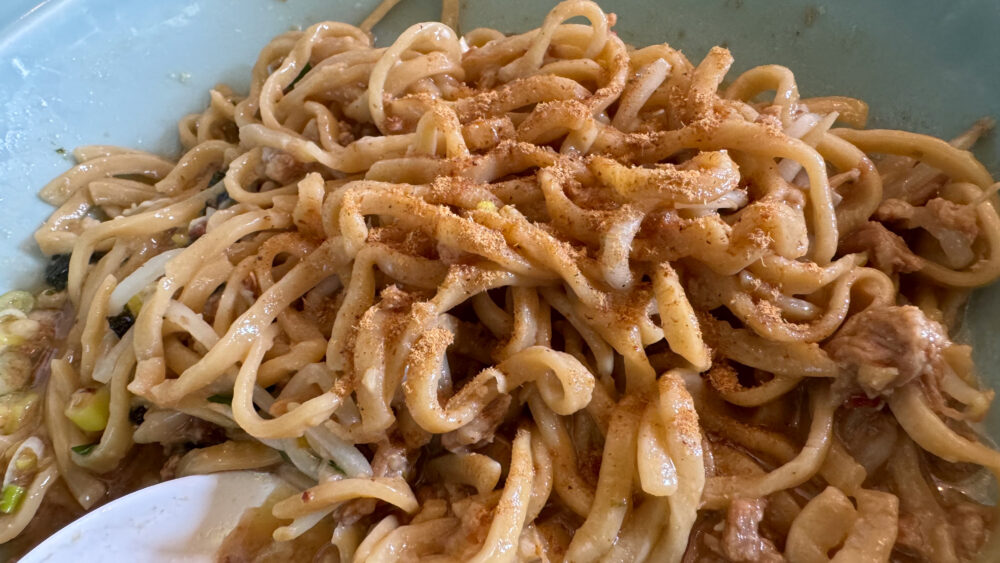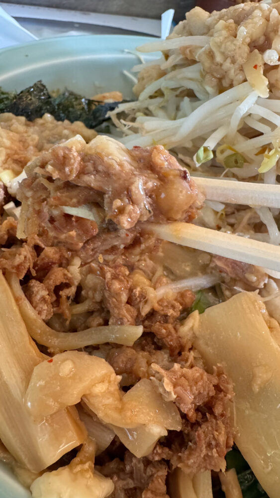 高木のぶぅは二郎系の中ではライトめな味付けですが、汁ナシ肉ソバは比較的しっかりめの味付けなメニューですね。