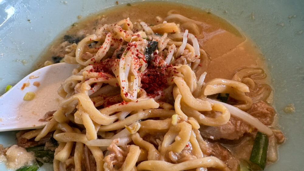 ▲卓上の魚粉で旨みをプラスするとより美味しい。すするスピードが落ちません。