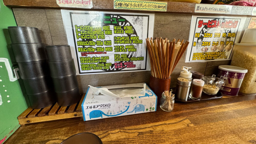 ▲トッピングの詳細は席に掲示されています。卓上調味料はめちゃくちゃ豊富。ニンニクはセルフ。