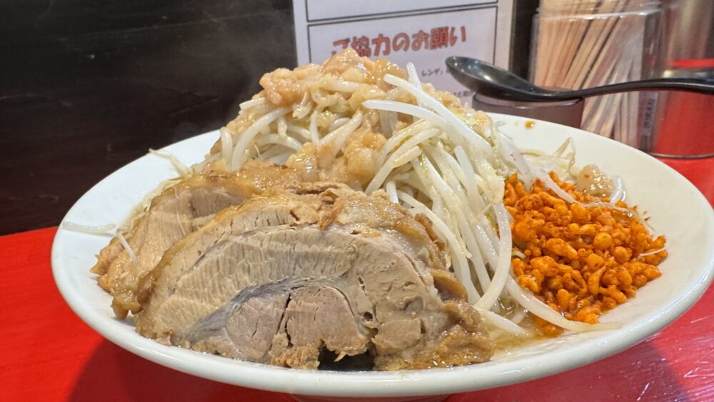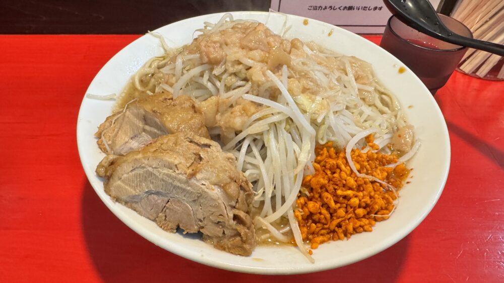前回は西巣鴨店でまぜそば大(野菜マシアブラ辛揚げ)+豚ダブル+生たまご+魚粉を楽しみました。