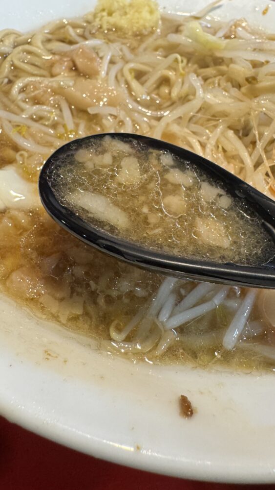 ▲スープは微乳化で豚の出汁感があって美味。背脂もプカプカ多め。
