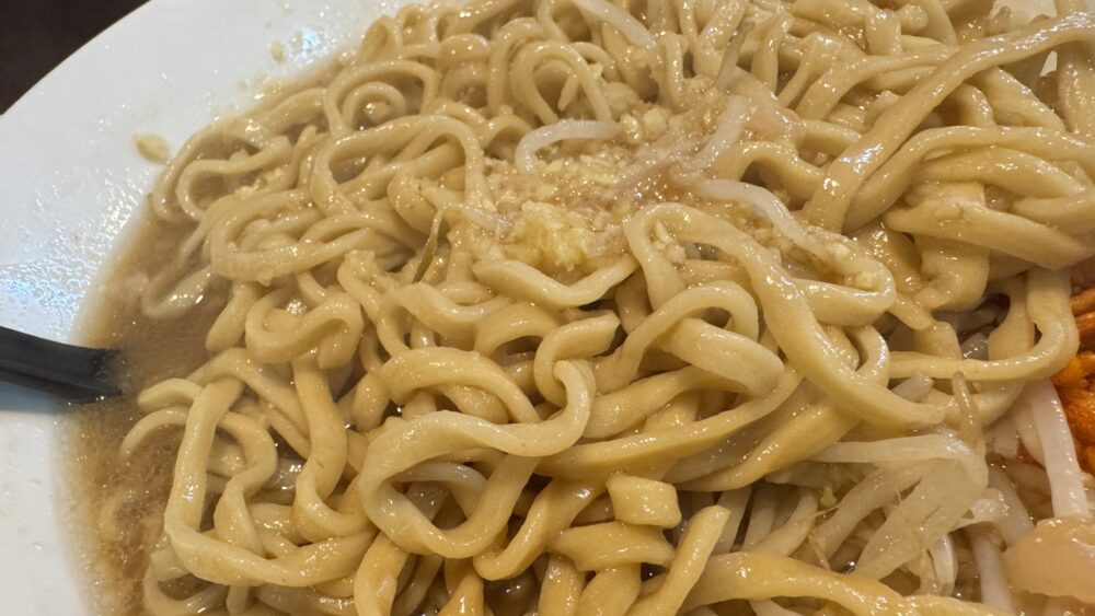 ▲野菜は、ザクっと食感で細めのもやし。たっぷりの背脂で食べると美味しいです。
