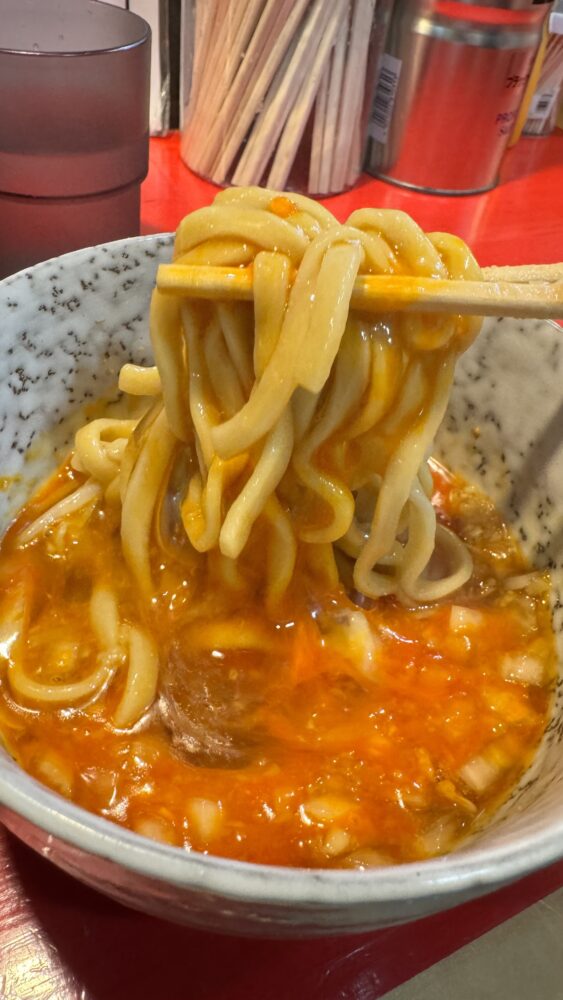 ▲続いて、辛揚げで味変。ピリ辛さが増したスープと麺も良き。