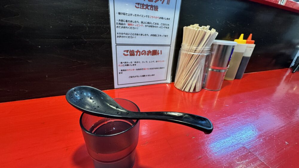 ▲卓上調味料はブラックペッパーと一味唐辛子、カエシ、お酢。無料トッピングや注意事項の張り紙もあります。