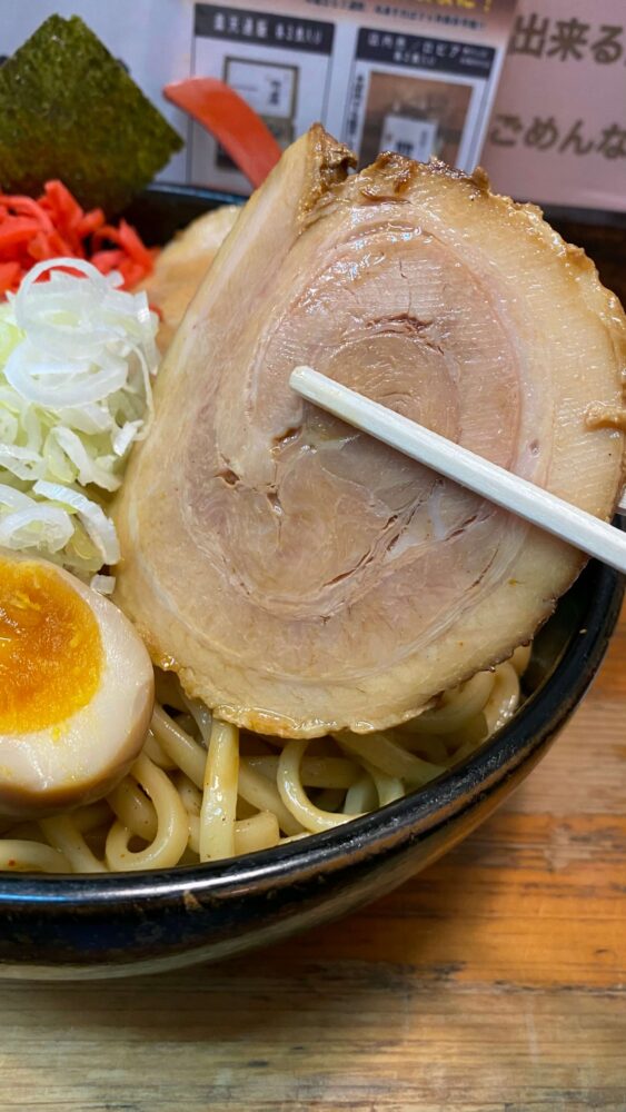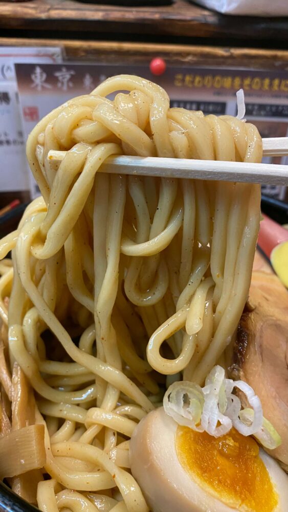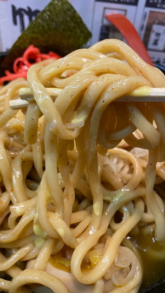 ▲竹屋と言えばの超極太麺。すでにタレが絡んであるのが嬉しい。タレは魚介×豚骨なので、ジャンクさより旨味が強め。