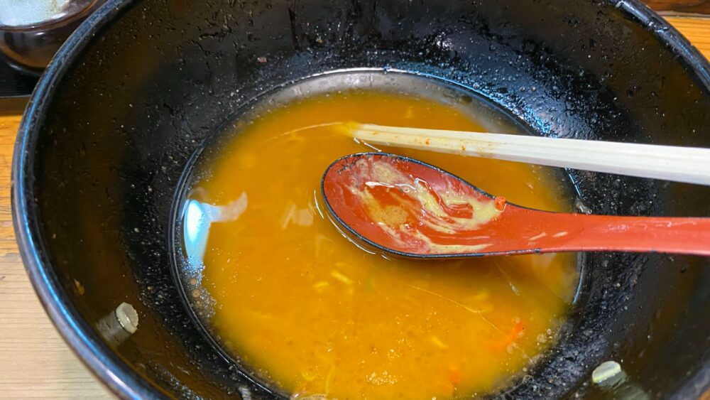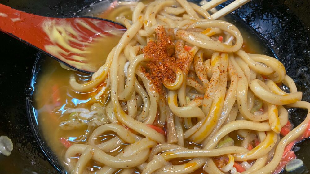 ▲終盤は卓上の唐辛子をイン。辛さで味が引き締まり、ラストスパートがかけやすくなります。
