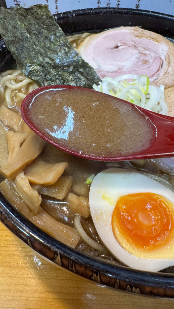 ▲醤油スープは魚粉と胡椒が効いて美味!グビグビ飲めますね。