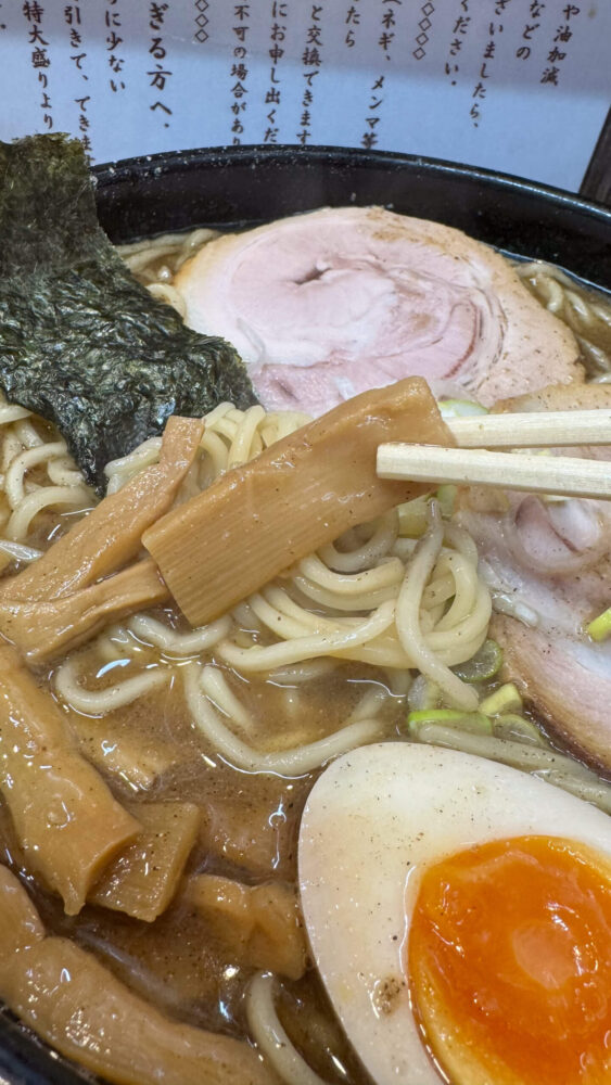 ▲メンマは厚めで短め。食感は柔らかく、味変に最適。