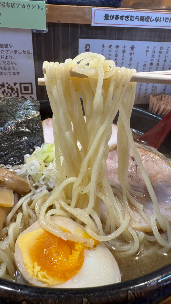 ▲麺はモチプリ食感。旨味が濃いスープにマッチしています。