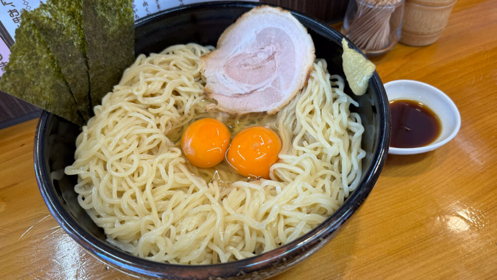麺と2つの生玉子が主役のシンプルな丼顔!並ですが、かなりの麺量に感じますね。