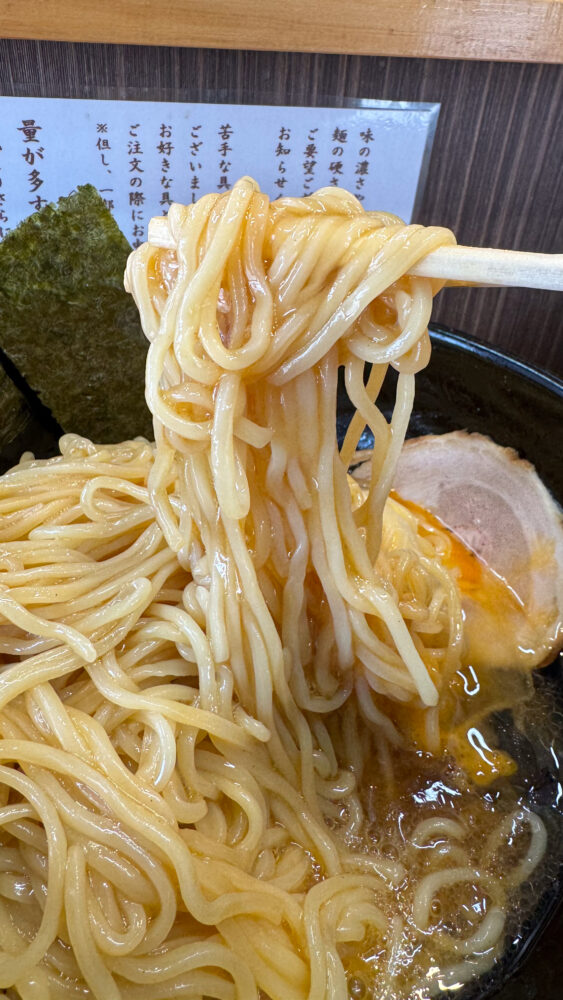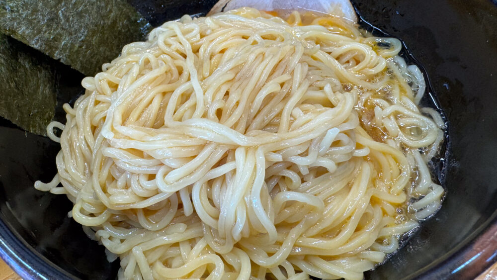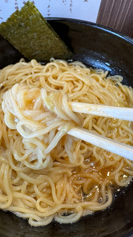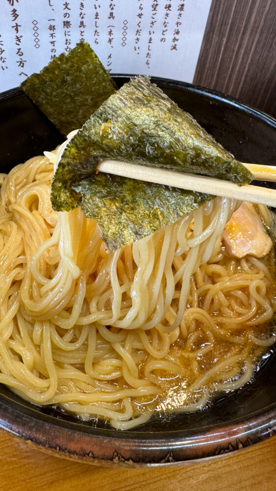 ▲麺を海苔で巻いて食べるのも美味。生玉子に海苔は鉄板な組み合わせですね。