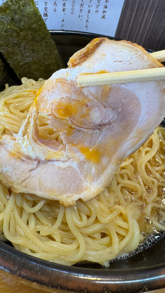 ▲大判のチャーシューも冷たい麺に触れているのでひんやり。すき焼き風に食べると旨し。