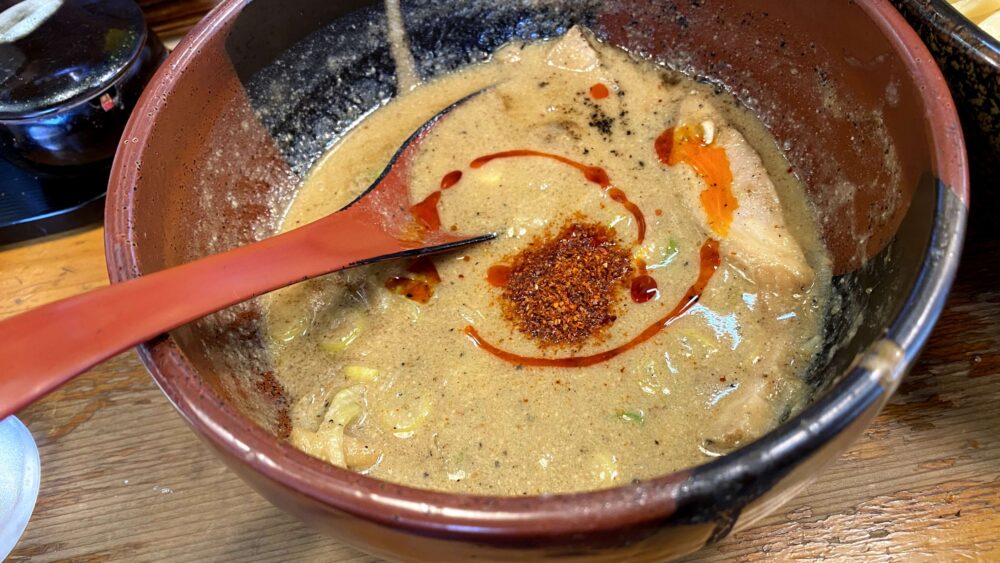 後半はラー油+唐辛子をつけ汁へ投入して味変。