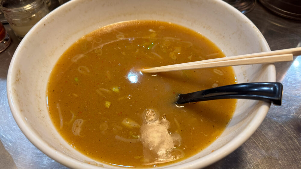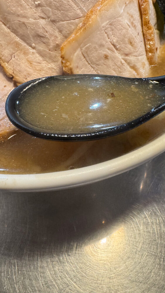 ▲まずスープから。魚介が効いて旨味もありつつ甘めなテイストで美味。抜け感はライトです。
