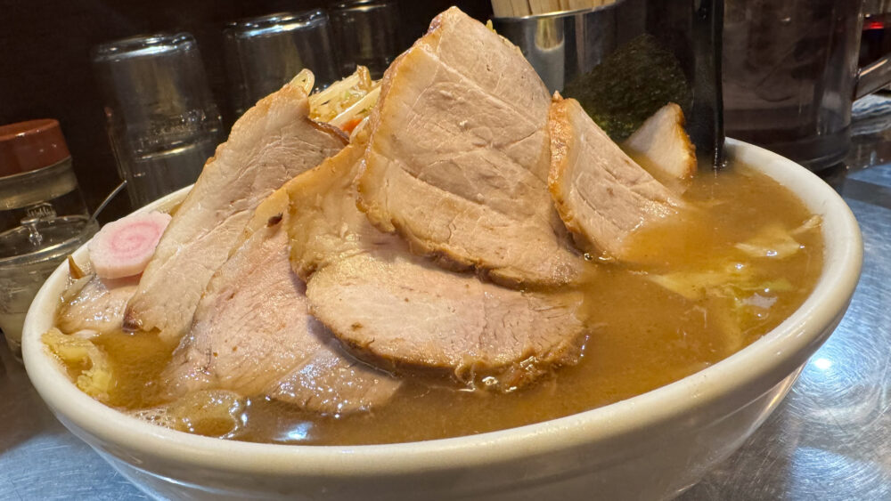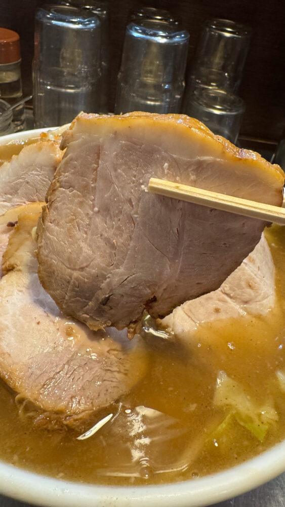▲横から見ると、チャーシューのボリュームもさることながら、炒めた野菜の量もすごくて、まるで二郎ライクなビジュアル。