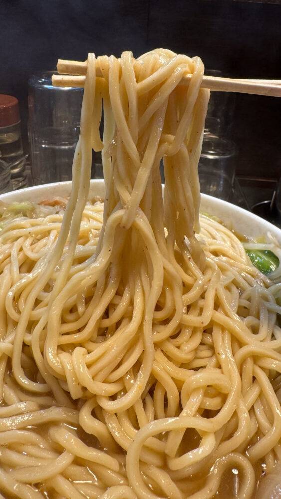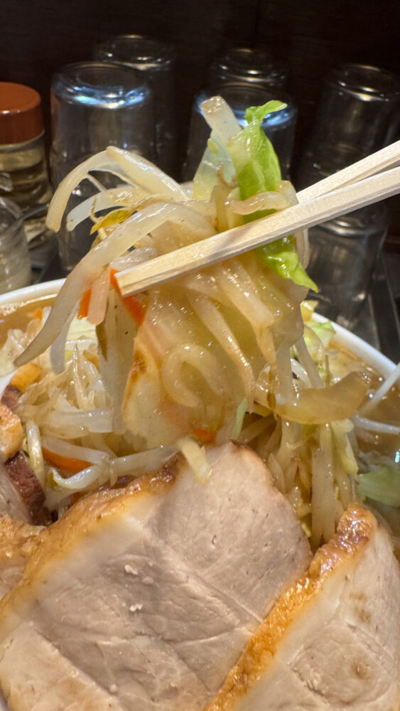 野菜がけっこう食感あって満腹中枢が刺激されますし、麺量も茹で前500g(正確には不明)ありそうなボリューム感だったので、一般的な二郎系の大ラーメンよりも多く感じましたね(笑)