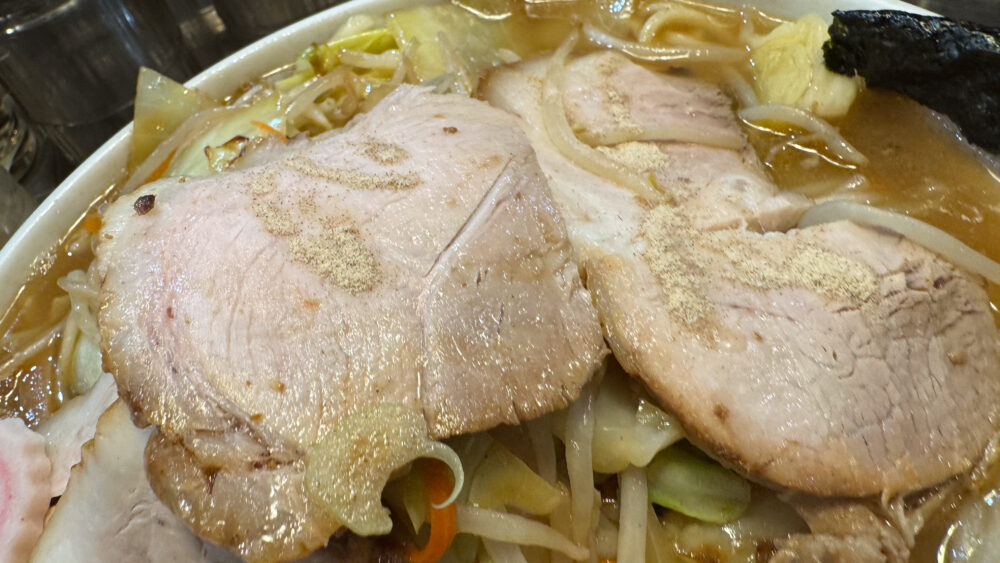 ▲チャーシューが枚数あるので、卓上のホワイトペッパーで胡椒豚に。味が濃くなったチャーシューと野菜を一緒に食べ進めます。