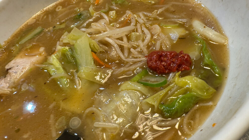 ▲終盤は卓上の豆板醤で旨辛に味変。ある程度麺は食べ終えたので、残りの野菜と豚を気合で食べ進めます。