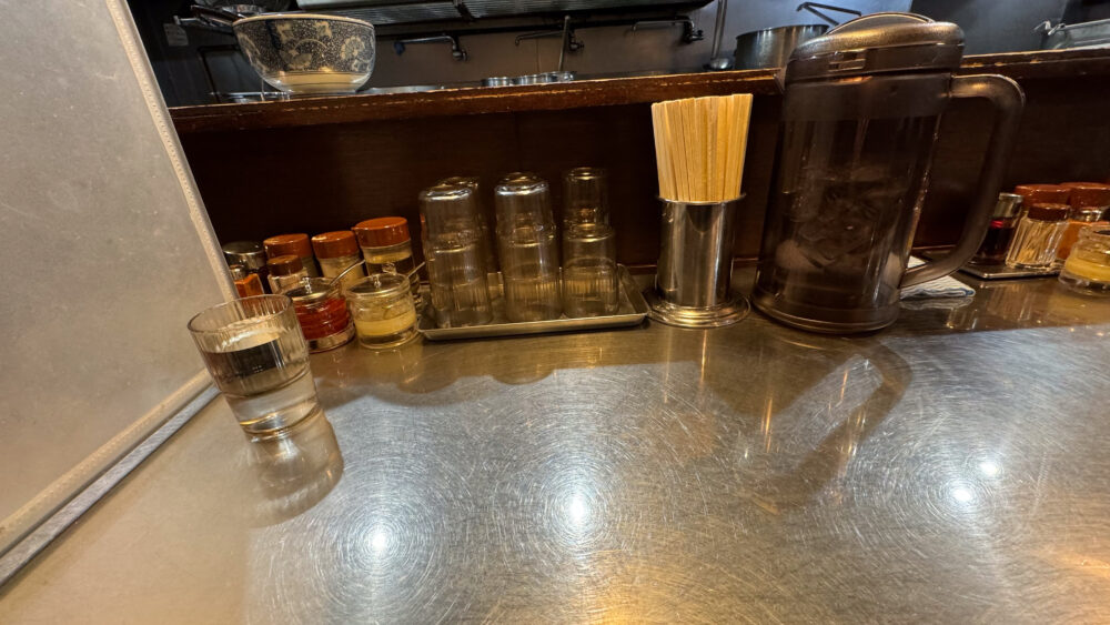 ▲卓上調味料は豆板醤、胡椒、一味、ラー油、酢、おろしニンニク等豊富なラインナップ。