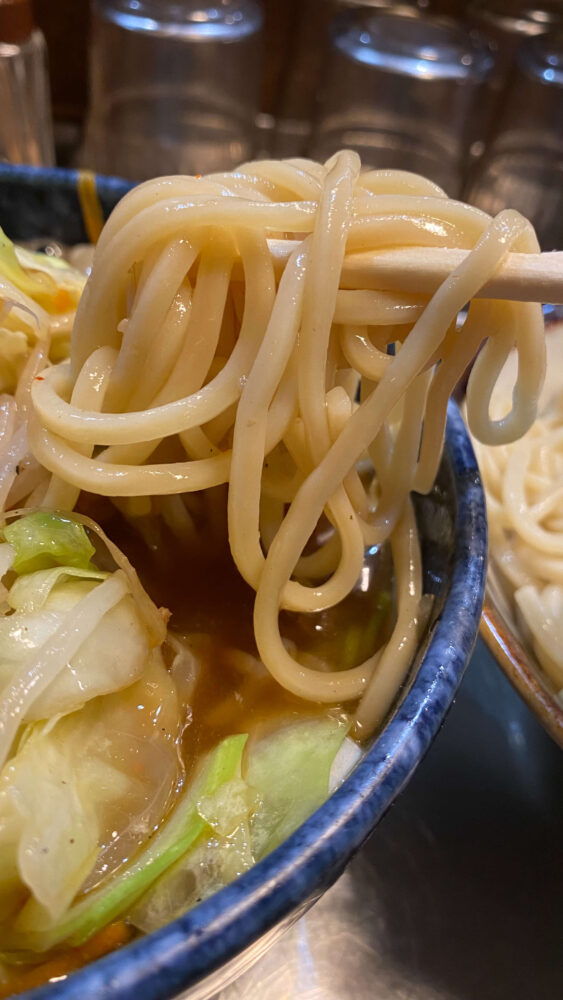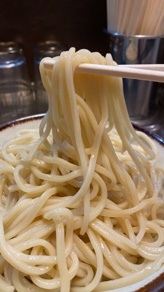 ▲つけ汁がしっかりめなので、太めの麺にもよく絡んで美味。