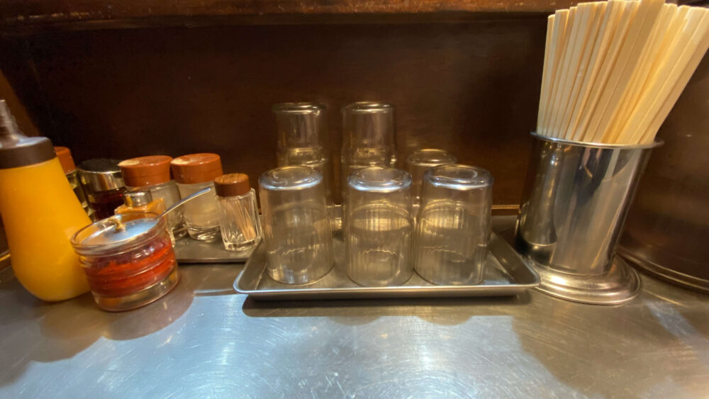 ▲卓上調味料は豆板醤、胡椒、一味、ラー油、酢、おろしニンニク等豊富なラインナップ。